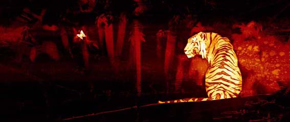 スポットに照らされているが、タイガーが暗いジャングルで際立ち、蝶が何か物語りを作っている。