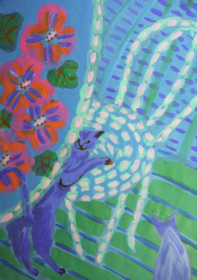 紙の地色の生かし方が巧みで、大胆な筆致と斜めのモチーフに躍動感がある。