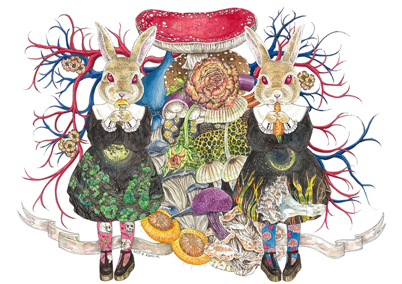 used art supplies or application soft線:コピックマルチライナー Artist comments1はうさぎときのこ、2はねこときのこ、ともに組み合わせは可愛いアイテムを選んでいますが、きのこはほぼ毒キノコを使用しており1においてはスカルや脳みそも描き込み「可愛さの中に潜んでいる怖さ」を表現してみました。 |
