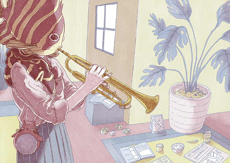 審査員評I love the storytelling in Elena’s work!! Hannah Li Miss Clownfish is a microcosm of many people, who enjoy peaceful life. Ailun Jiang I like the story. Belle Lee I love the colors of this illustrations. Fatinha Ramos 人の頭が熱帯魚になっている。 蟹江隆広 |