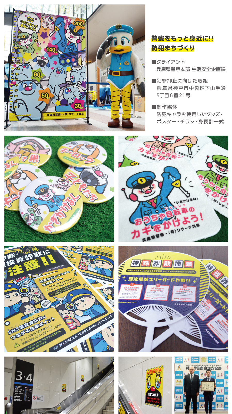 The name of the client兵庫県警察本部 生活安全企画課 The media in which the illustration used2024年度、防犯キャラを使用したグッズ ・ポスター・チラシ・身長計一式 Artist's comments「警察をもっと身近に!! 防犯まちづくり」 2024年度は、兵庫県警察をもっと県民の方々に身近に感じていただくことを目的とした施策として、防犯キャラを使用したグッズ・ポスター・チラシ・身長計一式を担当させて頂きました。 |